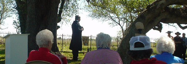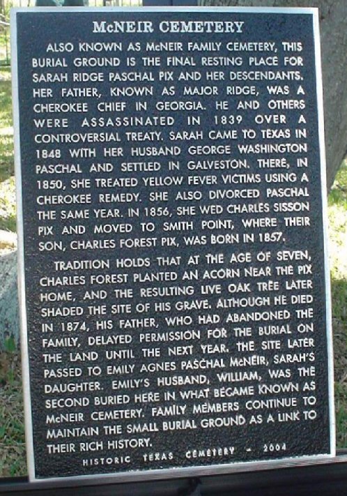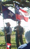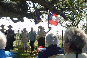 Following Ms. Doyen’s remarks, she and other family members placed beautiful floral arrangements on the graves of their ancestors. This led to a “stroll down memory lane” life story highlights, including Sarah Paschal Pix and Charles Forest Pix, presented by Mrs. Mary Edith Nelson Scott. Mrs. Ruth Nelson Stanford Hendrix then spoke of the lives of Emily Agnes Paschal McNeir, and William McNeir, a Confederate States Army Civil War Veteran, buried in the cemetery. A tribute to the Confederate Veteran followed with the presentation, at graveside, of the Confederate Flag, presented by Kenneth Standley, a member of the Spaight’s Battalion Honor Guard, and the Pledge to the Confederate Flag, led by Battalion member R. B. Scherer, Jr. Ralph William McNeir presented remarks of his ancestors, Forest Waldemar McNeir and Stella Frick McNeir. Ridge Watie McNeir gave the life history of George Paschal McNeir, Edith Hogan McNeir, and Margaret Celeste McNeir. George Paschal McNeir was descended from Revolutionary War soldier George Paschal. Mrs. Anne Roberts Benge gave the life history of Kathryn McNeir Nelson Roberts Stuart, Susan Roberts Nevills, and Floyd Wayne Scott (United States Navy, World War II). A tribute to the World War II Veteran began by the flag bearer, Aaron Kelly, of the Freeman Spath Post presenting the U. S. Flag at graveside. A Widow’s Rose Tribute was given by Mrs. Mary Edith Nelson Scott, widow of Floyd Wayne Scott. The ceremony concluded with a Rifle Salute by the Freeman Spath Post Honor Guard, Sam Hill III, Karman Stockwell, E. J. Manuel, and Allen Dequent. Mrs. Jean McNeir Williams and Mr. Harold Williams proceeded with the honors of unveiling the “Official Texas Historical Marker.” The unveiling was followed by Mr. Paul Ridenour and his guitar, leading the group in the hymn, “In the Sweet By-and-By”. Mr. Ridge Watie McNeir sang the words to “TAPS” accompanied by trumpeter Mrs. Pam Sweeney. Upon the closing remarks offered by Bob Wheat, Mrs. Dorothy McNeir Horner was presented with a Certificate Of Award, signed by Governor Rick Perry, presented by County Judge Jimmy Sylvia, commemorating the historic cemetery. A Benediction by the Rev. Barbara McNeir closed the ceremony. A delicious seafood meal, enjoyed by all, was prepared by Chef Eddie Nelson and the posse, served at Ben Nelson’s Spoonbill R.V. Park restaurant. |