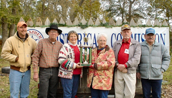 The Chambers County Historical Commission won the honor of having the Best Float in the First Annual Christmas Parade held in Anahuac last week. The float was decorated in a theme depicting Fort Anahuac in 1832, complete with a replica of a large field cannon. The float was occupied by Commission Members Karl Totzer, Kenneth Standley, Kay Willcox, P.D. Hankamer, Bob Wheat and Pudge Willcox and they are pictured with the trophy. The float was one of 29 entered in the parade which was sponsored by the Anahuac Area Chamber of Commerce. Tammy Hale of Anahuac organized the parade and plans have been made to make it an annual event. The parade was followed by a lighting ceremony at the Chambers County Courthouse and a tree lighting ceremony at the Thomas Jefferson Chambers Home where Santa Claus arrived by fire truck. A large crowd of spectators lined the parade route which started at the high school and ended at the Courthouse. |